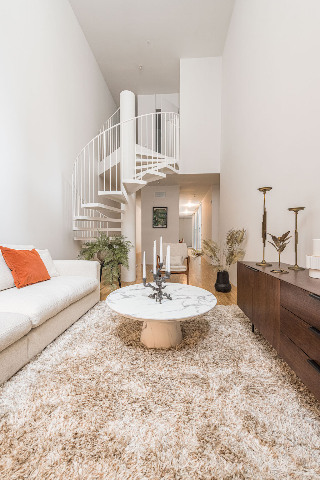 For this homestaging project we staged the living room, kitchen and one bedroom. The building has a very unique architectural design with a lot of white and high windows. It was quite a challenge to give this space a warm and homy feeling. But with respect of the design we succeeded in giving the apartment some character.